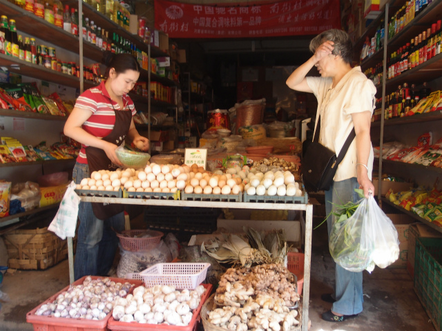 写真7は、卵・穀類・調味料店です。卵店はこの3種を扱うのが普通です。米などの穀類はこの店の場合奥にあります。