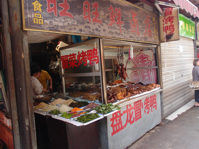 写真9は、烤鴨店で、鴨の丸焼きなどの炉焼き食品や、冒菜という副食品(おつまみ)を扱っています。手前に見えるのが冒菜です。
