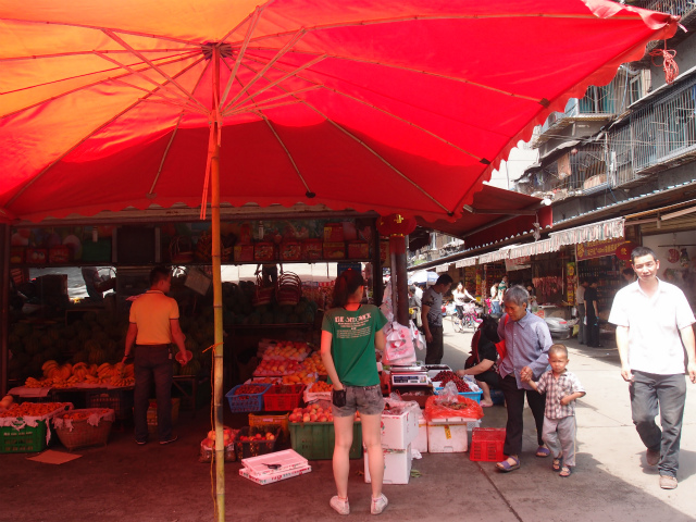 最後の写真10は、市場北口にある水果(果物)店です。右側の紫色はサクランボで今が盛りです。また,女性の左足もとに見えるのが桃です。いずれも成都近郊で収穫されるものです。特に四川省は桃の名産地で、空港の果物屋には土産用の箱入りが並べられます。奥の西瓜やバナナは南方地方のものです。福建省産の茘枝も出はじめした。