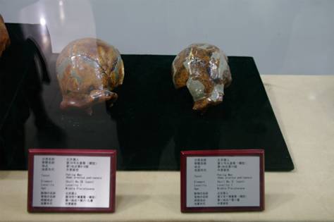写真2は、第3展示室の北京猿人頭蓋骨化石(レプリカ)です。共に第1地点発掘で、左がⅦ号頭蓋骨(8-9層)、右がⅡ号頭蓋骨(10層)です。この他、左右に何点かの頭蓋骨化石(レプリカ)が展示されています。
