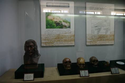 写真6は、第5展示室の山頂洞人の復元頭蓋骨と頭蓋骨化石です。山頂洞(第26地点)から発掘された山頂洞人は、約2万年前の古人類で、新人(ホモサピエンス)に属します。