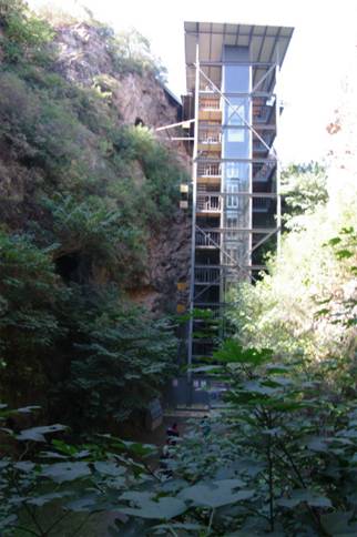 最後の写真8は、猿人洞(第1地点)です。遺址入口から博物館への上り道のほぼ中間(トイレの手前)、左手に入る道から行きます(案内板は右側に小さくあります)。写真をご覧のように、エレベーターが設置されて、研究者など許可された人が洞を見ることが出来ます。天然の石灰岩溶洞で、東西140m、南北の最広40m・最狭2mです。全体で13層の堆積層があります。なお、第13層から下の試掘では化石・遺物は発見できていません。