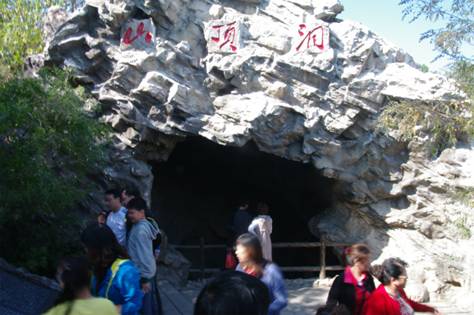 写真7は、その山頂洞人の発掘された山頂洞です。博物館手前で、左に上り道を取ると道なりに行けます。3個の完全な頭蓋骨化石の他に、これを含め8人分の化石や動物化石・石器が発掘されました。洞口は高さ約4m・幅約5mです。洞は東南から西北に緩やかに傾斜しており、南北約8m・東西約14mです。