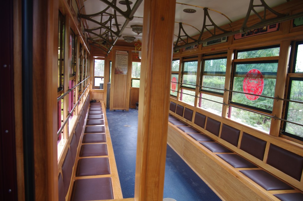写真2は、側面から見た電車全景です。杭州俊士鉄路設備有限公司製造で、最高時速20km、車長9.7m・車幅2.2m・車内高2.2m、座席数34、定員90人です。車内は不燃処理をした木材が基本となっています。写真に見るように、ボディー横下部は1930年代の上海市での広告塗装仕様となっています。これには女性関係のが多く、もちろん繁体字表記で縦書き(横書き見出しは右から)となっています。現在車輌は「文博號」と「安仁號」との2両があり、正面の行き先表示には「中國博物館小鎭」とあります。なお、左側が進行方向で、先に車庫があり、車輌1両(安仁號)入っていました。