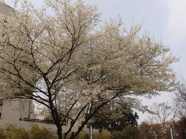 〔追記〕 宿舎近くに大きな桜の木があります。今日土曜日(24日)は青空も見え、これを撮ってみました。下の写真がこれです。右下に小さく白色や桃色に見えるのが木蓮です。これもほぼ満開状態です。なお、オリンパスXZ-1での撮影です。