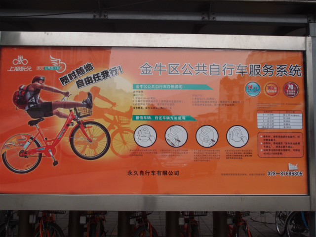写真1は、西南交通大学北門の西側付近に設置された公共貸し出し自転車案内板です。この案内板の歩道側に自転車が並べて置かれています。金牛区の自転車は上海永久自行車有限公司制で、案内板左に描かれた自転車が使用自転車で、案内板にはご覧のように同社の名前が入っており、広告の役割を果たしています。何しろ成都市は中国の大都市中で自転車利用が最も高いところですから(現在は電動自転車が過半ですが)。