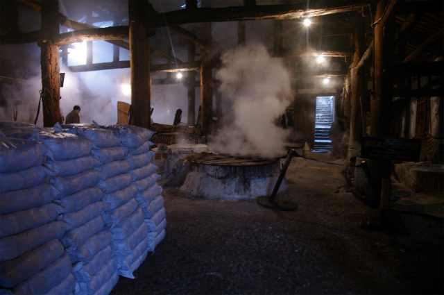 天車の奥の一段と高いところの建物が竈房です。写真7はその内部の様子です。ご覧のように湯気を上げ塩水を塩へと煮詰めています。奥に作業する人が見え、手前に精製された塩袋(20kg)が積み重ねられているように、ここの塩井は現役で生産活動を続けているのです。