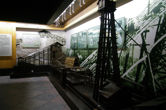 写真3は、古代の煎塩竈鍋と塩井のジオラマ模型です。奥の塩井から汲み上げられた塩水を手前の竈鍋で煮詰めて塩へと精製するのです。このように、ここでの展示は古代から現代にいたる自貢市での塩井による塩製造法を模型などを用いて展示しています。