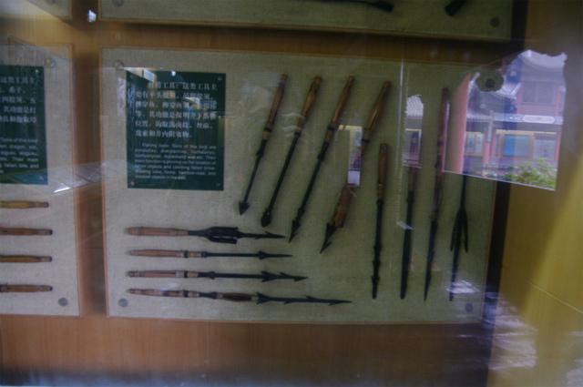 右庁から前庁2階にかけては「中国井塩科技史」の展示室です。ここには、実際に使用された各種の工具などが展示されています。写真4はその一例で、塩井を掘削・補修する工具の一つとして打𢭐工具(サルベージ)です。
