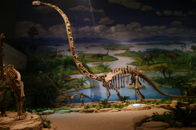 写真4は、大山鋪発掘の中ジュラ紀(1.6億年前)の天府蛾眉竜(Omeisaurus tianfuensis)です。大きいのが長20m、小さいのが長6mの幼年恐竜です。親子を模して展示しているようです。