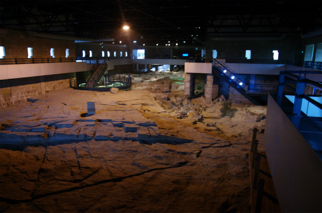 「恐竜世界」を出て、中央大庁に戻り、奥に進むと「恐竜遺址」です。ここは恐竜化石埋蔵現場をそのまま保存展示したところです。写真5は、遺址最奥からの全景です。面積1500㎡、世界最大規模の埋蔵現場です。数千の化石が埋蔵されています。基本的には上から俯瞰することになりますが、写真でご覧のように、中頃に階段が設置され下に降りて、より身近で見ることが出来ます。また、代表的な化石に関しては説明版(12か所。李氏蜀竜・天府蛾眉竜・原始新鳥類・自貢四川竜など)が設けられています。