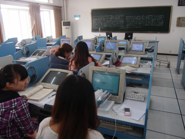 今回は、西南交通大学の犀浦校区(現在は学部生の講義・実験は本キャンパス。旧キャンパスの九里堤校区は大学院生)で今学期に使用している教室を紹介します。写真1・2は、普通教室です。約100人余収容です。ご覧のように、教卓にはコンピューター(DVD機も)が設置され、プロジェクターとマイクも設置されています。スクリーンを見るため、窓には遮蔽カーテンが設置されています。以上の設備は基本的にすべての教室に設置されています。このため、多くの教師がパワーポイントでの映写により講義を行い、あまり黒板を使用しなくなっています。