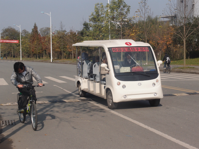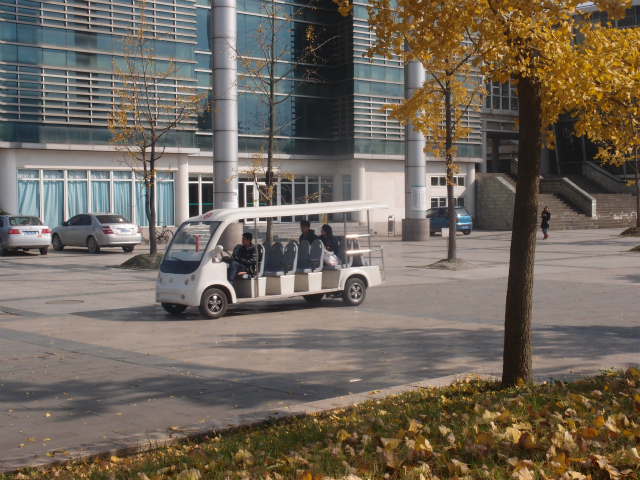 2012年秋の新学期から、西南交通大学犀浦校区に手招き電動カートの運行が始まり、活躍中です。今回はこれを紹介します。写真1をご覧のように、電動カート(1席・3席4列の13人定員)フロント上部に「校園交通招手即停」と表示があるように、本カートは随意手招きの乗車が出来ます(降車も運転手に告げれば随意)。北学生寮区から正門(南門)・校舎・図書館を経由する循環路線となっており、運賃は1元です。後部車輪部に電池とモーターが格納されています。