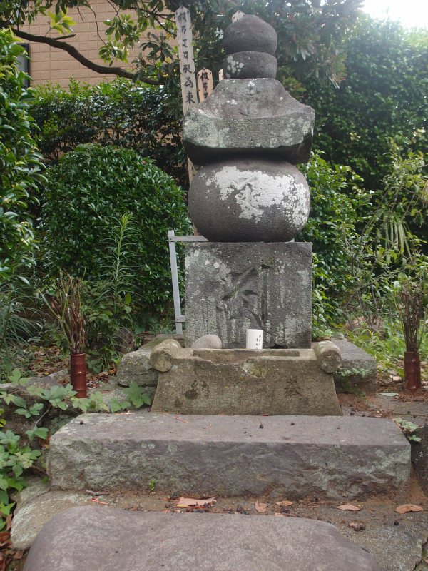 葛見神社から、道なりに上っていき、左に大きくUカーブを過ぎて少し行くと、伝伊東祐親墓(伊東市大原1-10)です。神社からは約500m余です。道の左側にあります。写真3は、祐親墓と伝える五輪塔正面です。安山岩の高140.5cmで、空風輪・火輪・・水輪が14世紀前半、地輪が13世紀のものと推定されています。なお、当地には皇太子徳仁親王訪問(1980年9月)記念の碑もあります。