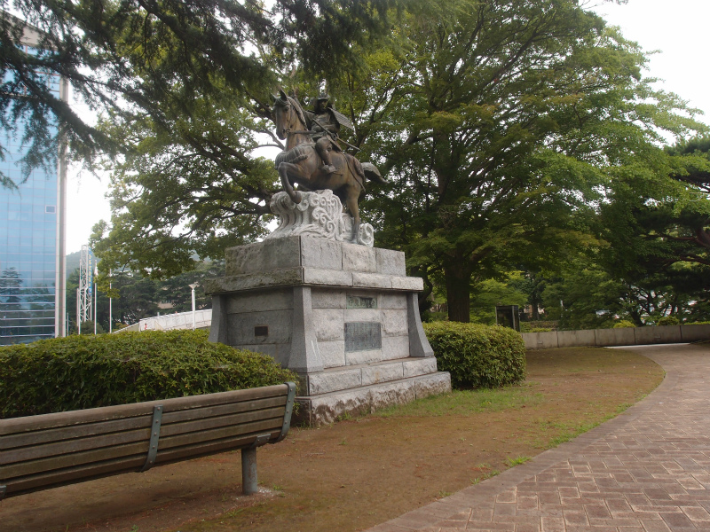道を進み国道13号に出て、左に国道に入り市立東小学校を過ぎると、右の丘に市庁舎がそびえています。この手前が物見塚公園として整備されています。墓から約400m余です。物見が丘(物見塚)は伝伊東祐親館址です。最後の写真4は、この公園の市庁舎寄にある市が建立した伊東祐親騎馬像をとらえたものです。像の後方が市庁舎です。公園の左側(西)端からは伊東の海が一望できます。葛見神社の西一帯も伊東氏館址との伝承もあり、すると、平時の館は伊東大川東岸平地に位置して、詰めの館は物見が丘にあったとするのが、位置的見て、蓋然性があると考えることができます。とすれば、海を一望できる当地が物見が丘と称されたのも理解できます。