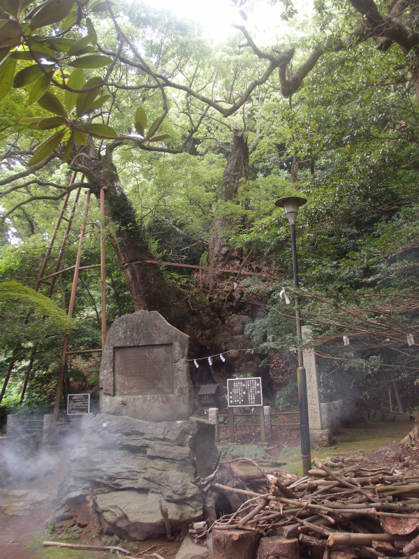 写真2は、拜殿の左奥にある天然記念物(1933年2月28日指定)の樟です。樹齢約千年、目通り約15mという老巨木で、幹の下部は空洞となっています。なお、手前の石碑は晩年を伊東市で過ごした昭和初期の首相若槻礼次郎が寄進した「贊老樟」碑です。