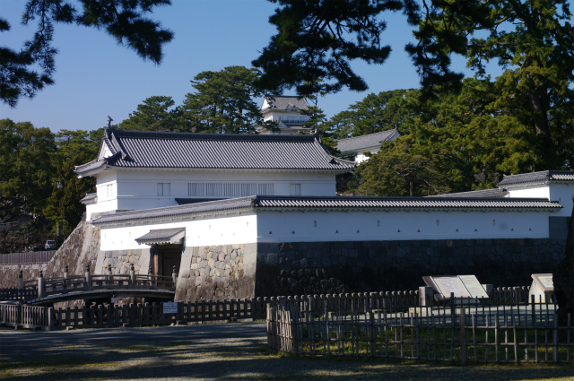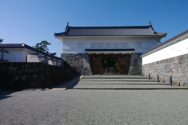 写真3は、馬屋曲輪から見た、1997年(平成9)年復元の銅門(内仕切門・枡形・渡櫓門)と住吉橋です。後方に常盤木門と天守閣が見えています