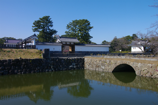 写真2は、2009年(平成21)年復元の馬出門と馬出門土橋(めがね橋)です。この門を入ると白壁に囲まれた枡形となり、左に内冠木門をくぐると、馬屋郭となります。
