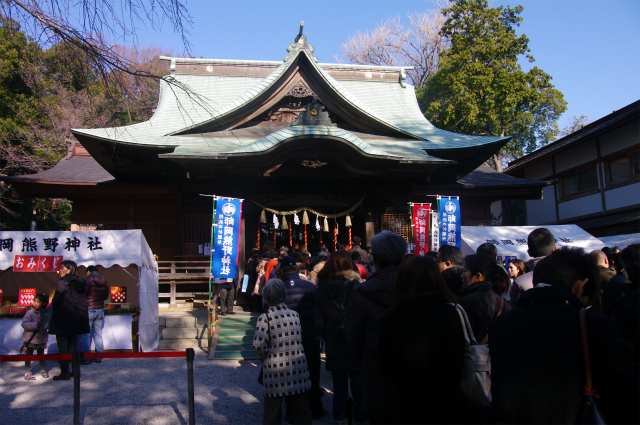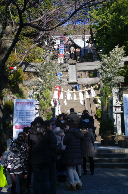 ご近所の師岡熊野神社(横浜市港北区師岡町)に午前初詣に行ってきました。長らく中国にいたので、20数年ぶりの初詣です。本社は聖武天皇の724(神亀元)年創建と伝えられています。写真1は、鳥居前で行列を作り参拝を待つ人々です。普段は参拝者もほとんどいない地元の神社(明治の社格は最初県社で、後地元の要望で33か村郷社)ですが、境内へは写真のように急な階段でもあり、人数を区切って参拝をさせるため、係員が出て整理のため行列を作ります。