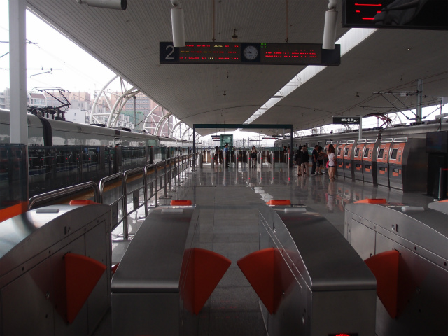 写真2は、駅舎内の風景です。御覧のように、A口とB口(東側、国寧西路―国道213号・老成灌路)がありますが、今日は混乱を避けるためかB口は閉鎖されています。右側が售票台(切符売り場)で、左側が自動改札です。そして、エスカレーターでホームに上がります(上り口は2か所)。写真には見えませんが、右手には自動券売機が設置されています。