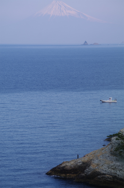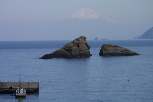 昨年の夏に続いて、本冬にも雲見温泉に行ってきました。そこで、雲見海岸からの冬の富士山をお見せします。写真1は、雲見大橋上から牛着岩(夫婦岩)越しにとらえた富士山です。