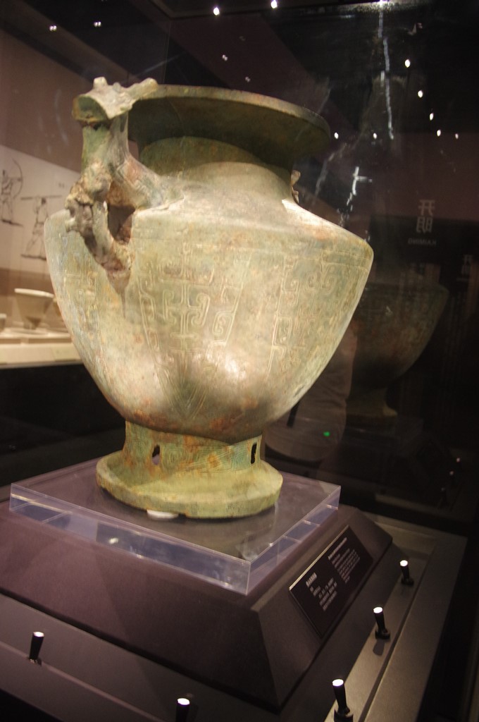 2階の最初の展示は「九天開出―成都―先秦時期的成都」です。古蜀文化の最古、宝墩文化(BC2500~1700年「蚕叢」「柏灌」、龍山文化)からです。陶瓶等の陶器や石矛等の石器が展示されています。次いで、三星堆文化(BC1700~1200年「魚鳧」、夏晩期~商後期)、です。ここでは玉壁等の玉器、銅人頭像等の銅器が展示されています。そして、金沙・十二橋文化(BC1200~500年「杜于=望帝」、商後期~春秋後期)、と続きます。ここでは陶器、石器、玉壁等の玉器、銅龍形紐蓋等の銅器が展示されています。写真1は、その獣頭双耳銅罍です。