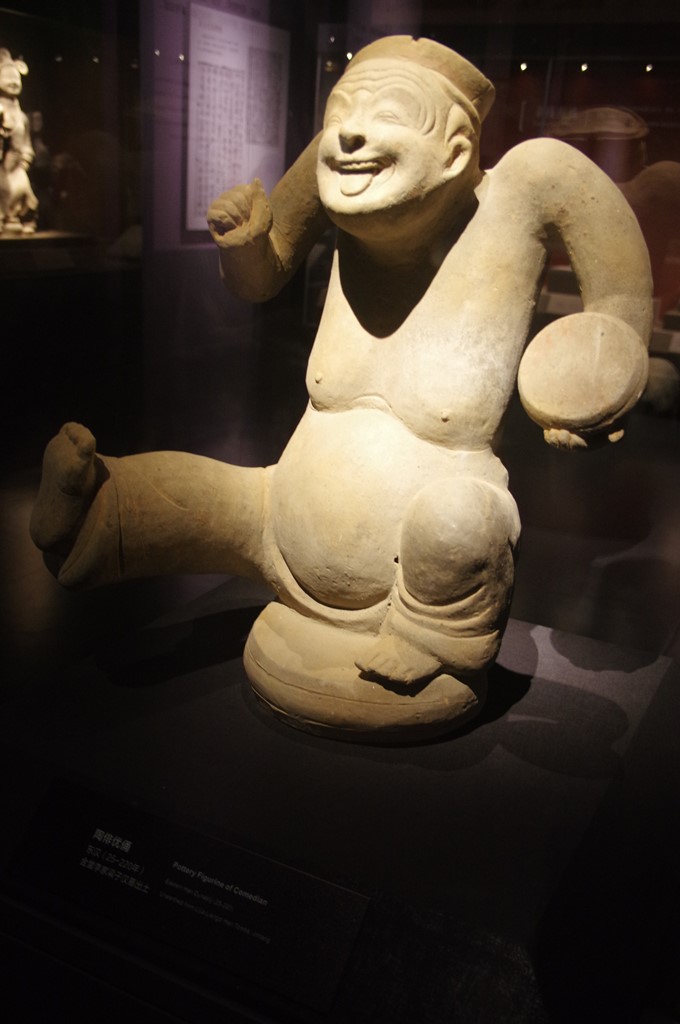 次の展示は「西蜀―秦漢至南北朝時期的成都」です。まずは前漢・後漢期です。石辟邪座等の石像からはじまり、陶台等の陶器、「蜀都工官」銅盆等の銅器、鉄工具等の鉄器と続きます。写真3は、陶俳優俑(後漢)です。
