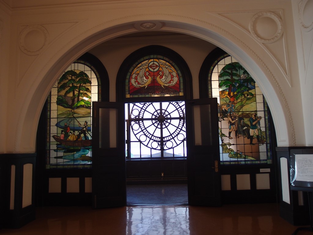写真4は、2階階段の所にある「黒船ポーハタン号」ステンドグラスです。本船は1854(嘉永7)年の黒船来航時のペリー提督乗艦です。