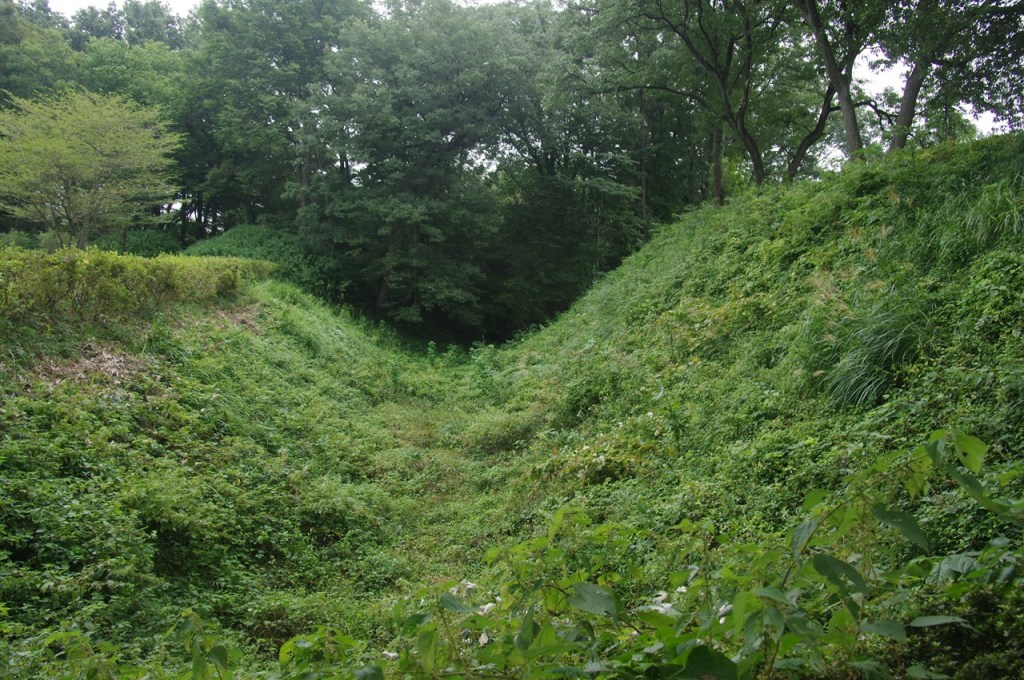 写真4は、「菅谷館」(埼玉県比企郡嵐山町菅谷)の本郭と二ノ郭間の空堀です。菅谷館は鎌倉期前期の秩父一族嫡宗の畠山重忠の館とされるところですが、現在の遺構は本郭・二ノ郭・三ノ郭・西郭・南郭からなっており、戦国期の城郭の様を見せています。これは写真の空堀が薬研堀であることからも分かります。本館は比企郡城館跡群菅谷館として国史跡に指定されています。