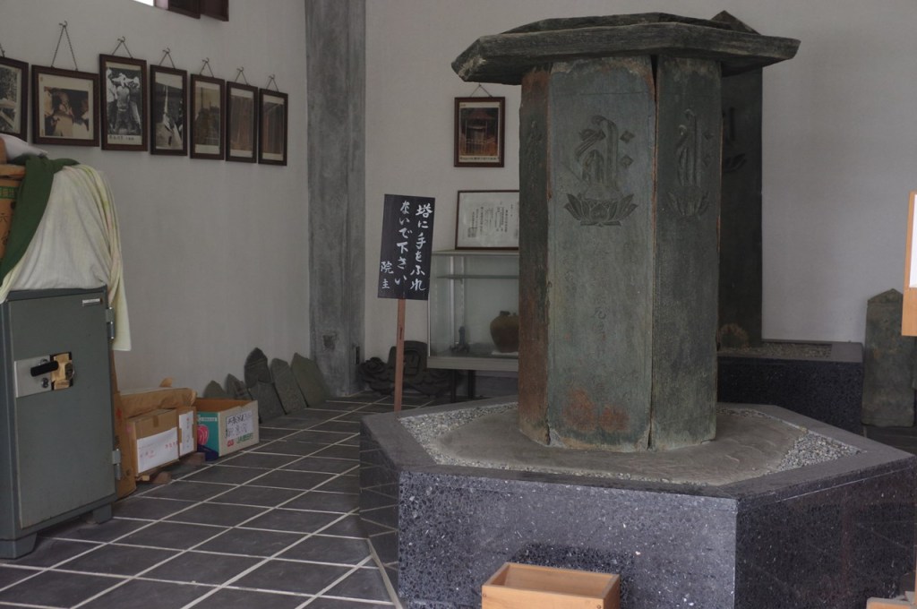 写真5は、大聖寺(埼玉県比企郡小川町下里字観音山1857)の国指定重要文化財の「石造六角法華経千部供養塔(六面塔)」です。6枚の偏平岩を六角の筒型に組み合わせたもので、高136cm・各面幅32cm、当地で産する下里石(緑泥片岩)製です。康永三年(1344)三月十七日の銘があることから、南北朝期の造立と分かります。写真に見るように、各面上部に阿弥陀如来の種子を蓮台に乗せています。天台宗の石青山大聖寺威徳院は1340(暦応3)年に希融法印開山・源貞義開基と伝えています。
