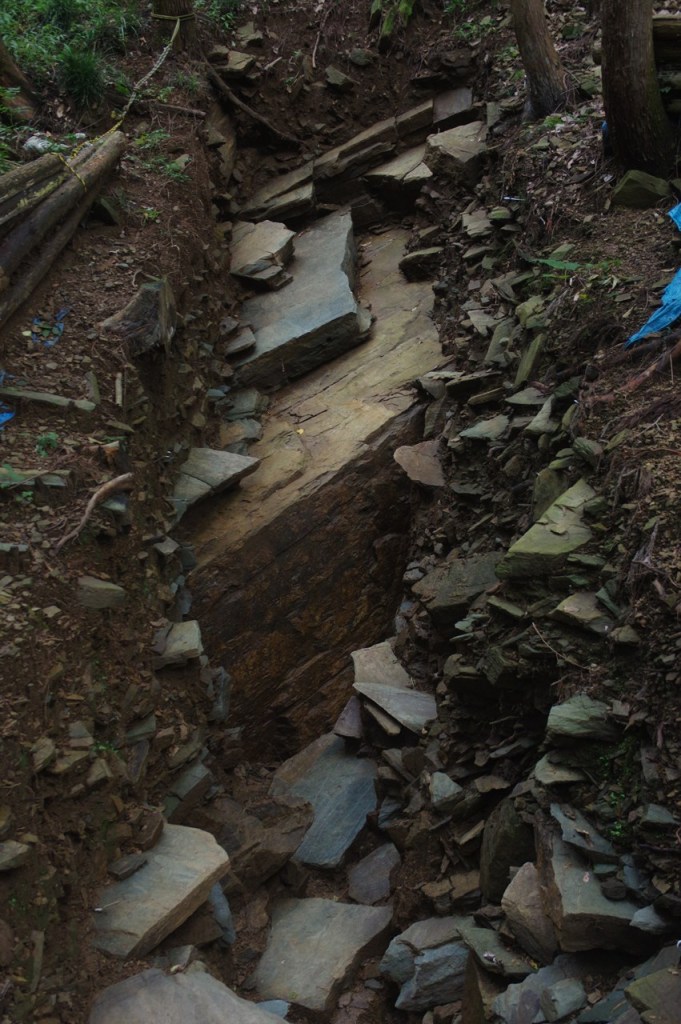 写真6は、「下里板碑割谷遺跡」(埼玉県比企郡小川町下里字割谷)の第1号トレンチです。本遺跡は国史跡に指定されています。本トレンチは黒褐色色の岩盤(上段)・畳一畳大の板石(中段 長1.8m・幅80㎝以上・厚18~22㎝の緑泥石片岩 横割りを目的とした工具痕あり)・褐色に風化した岩盤(下段)の3段の階段状となる石材採石遺跡遺構です。