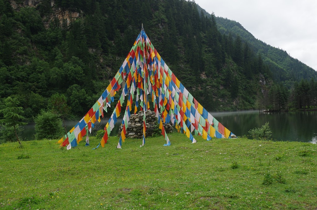 達古氷河は1992年に人工衛星の画像解析から日本の科学者が発見したもので、洛格斯聖山に位置します。四川省では最高峰の貢嗄山(ミニヤコンカ・7556m)の海螺溝氷河が知られていますが、本氷河これに次ぐものです。まず、入口から専用エコバスに乗り、原始林に覆われた達古河渓谷を北に遡ります。本渓谷は10月には紅葉の名所となります。写真1は、最初の景勝地、金猴海です。名の通り付近には希少動物の金絲猴が生息しています。本渓谷はチベット族の居住地なので、このタルチョ(お経を書き込んだ五色の祈祷旗)を写し込みました。御覧のように朝なのと天候から淡い霧が湖面に漂っていました。