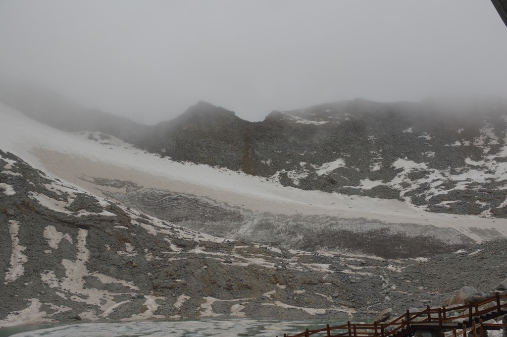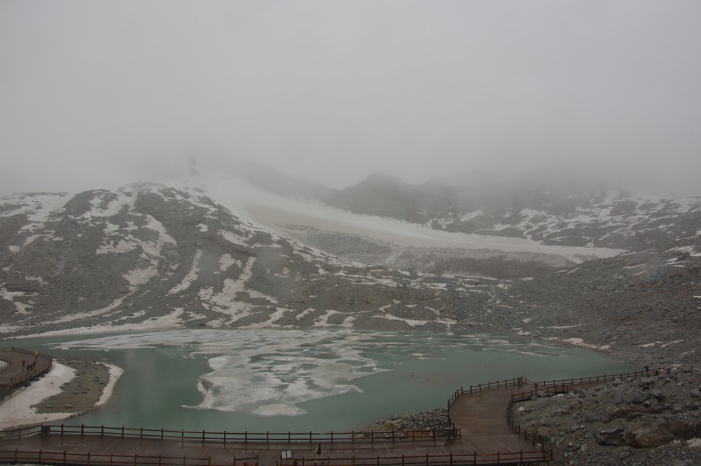ロープウェー乗り場に到着して、8人定員のロープウェーに約15分乗ると、一気に約千mの高度を上げ、氷河観景台に着きます。写真4は、観景台から見た一号氷河です(ここからは一号・二号・三号氷河が見られます)。下の池は東措日月海です。残念ながら、天候の関係で山の全景を見るとことができませんでした。