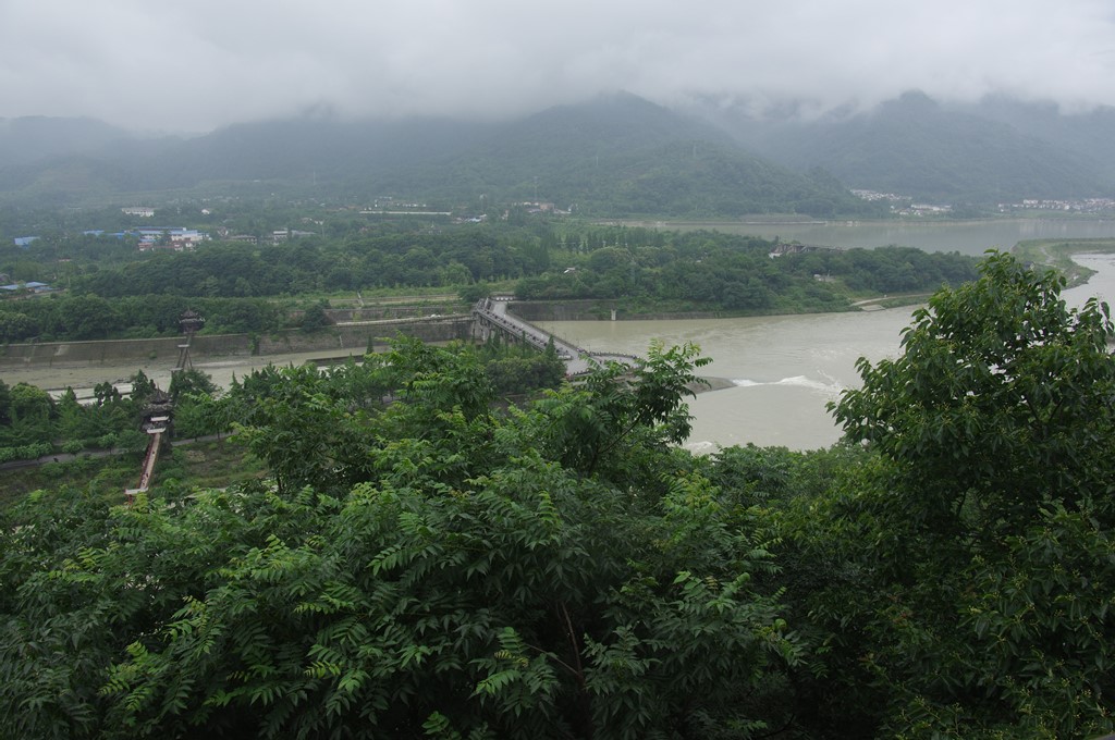 二王廟の上、秦堰楼入口から入りました。写真1は、秦堰楼から俯瞰したものです。中央が岷江外江(本流=金馬河)の堰堤(ダム)です。これは1974年に完成したものです。この右に突き出ているのが分水堤の魚嘴で、ここで岷江の流れを掘削した内江(灌江)と外江に分離します。魚嘴から左に人口の中州となっています。左に見える橋は安瀾橋で吊橋です。
