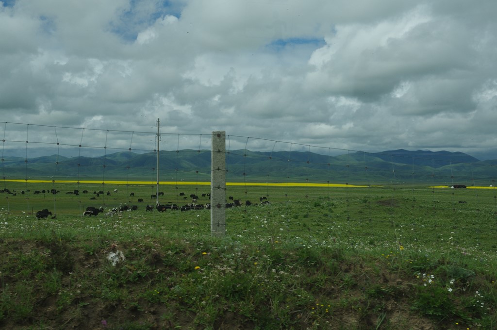 写真1は、黄河九曲第一湾への途上の紅原大草原を車内から撮ったものです。ご覧のように、遠景に菜の花畑が広がり、草原にはヤクが放牧されています。