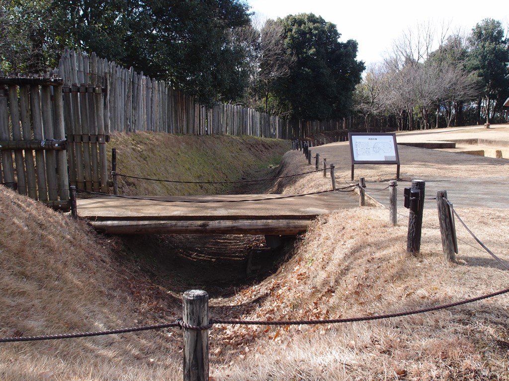 写真2は、環濠集落本来の入口に当たり、遺構から堀上に木橋(材質ナラ)が架けられていたのを復元したものです。木柵・土塁は空堀(最大で幅4.5m・深さ2.5m)の外側にあります。遺跡全体の東側約1/3が保存保護されて、この保護部分全周250mを柵・土塁・空堀が囲んでいます。