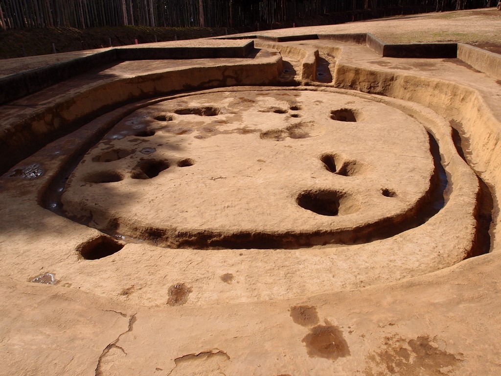 写真3は、復元された住居です。7棟が復元展示されています。入母屋造りで主柱は檜で屋根は茅です。この他、住居址20棟が保存されてその位置を石で囲んでいます。遺跡全体は約1.5mの盛土で保存されています。