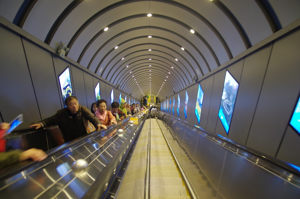 写真8は、桟道が終わり、天門洞下広場への登天門エスカレーターです。近年に起きた崩落事故で天門洞は強化工事中で、階段は通行禁止のため、エスカレーター利用となりました。
