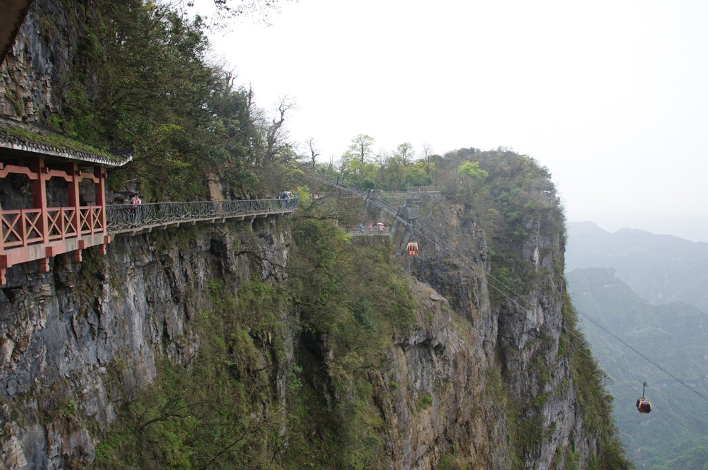 写真4は、山頂站からの鬼谷桟道上から、ロープウェーを撮ったもので、左の岩壁に隠れたところが山頂站です。