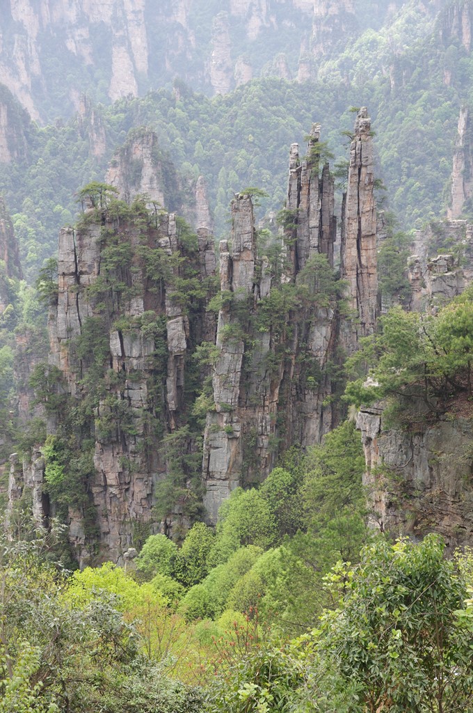 写真2は、縦位置で撮った御筆峰です。奥右側の立った3本の柱群がそうです、高100m余です。