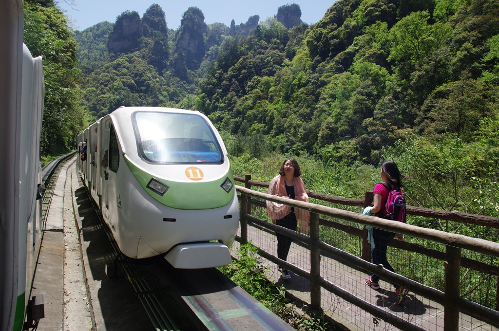 23日(日)午前の次の観光は武陵源風景名勝区の索渓峪自然保護区の十里画廊景区です。金鞭渓~専用バスでまず移動します。徒歩道もありますが、モノレール軌道のトロッコ電車で観光です。