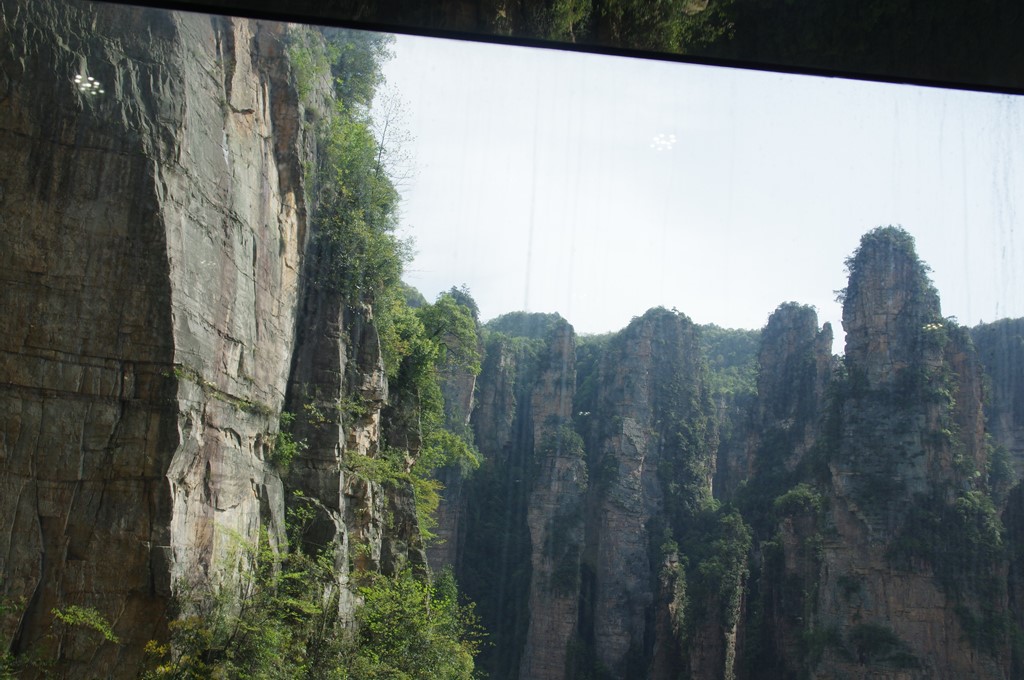 写真1は、2002年に運行界開始した運行高度326mを66秒で上る百龍天梯(エレベーター)です。「世界第一梯(世界一のエレベーター)」碑が立っています。3基のエレベーターが設置されています。ご覧のように2基が百龍天梯上站です。