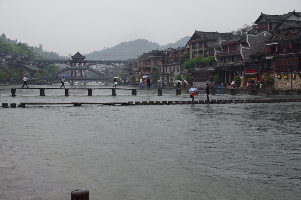 写真7は、沱江にかかる跳岩です。これで川を渡れます。雨模様のため渡る人が少なく、無人の時を狙って撮りました。