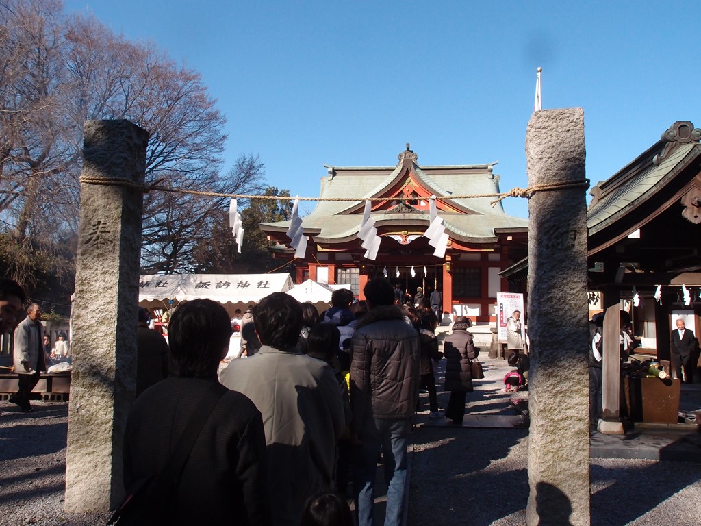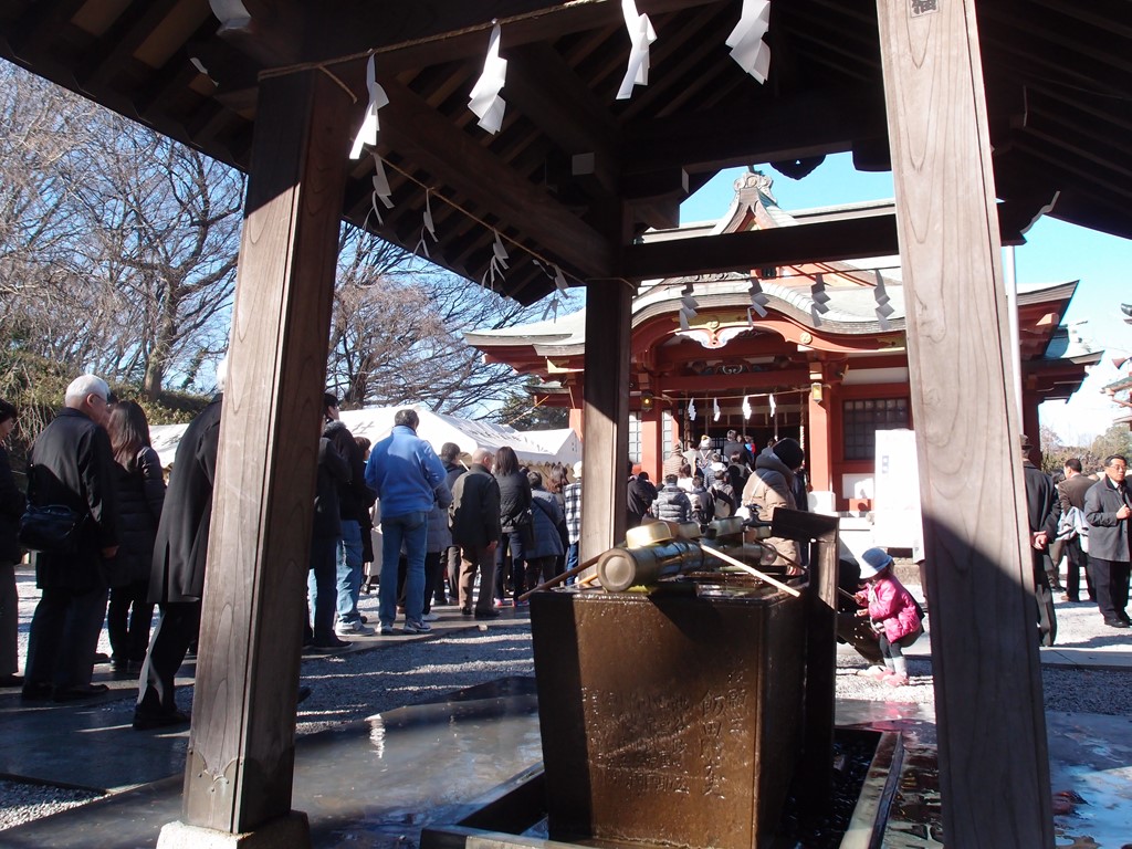 写真4は、御手洗越しに見た社殿と初詣の列です。