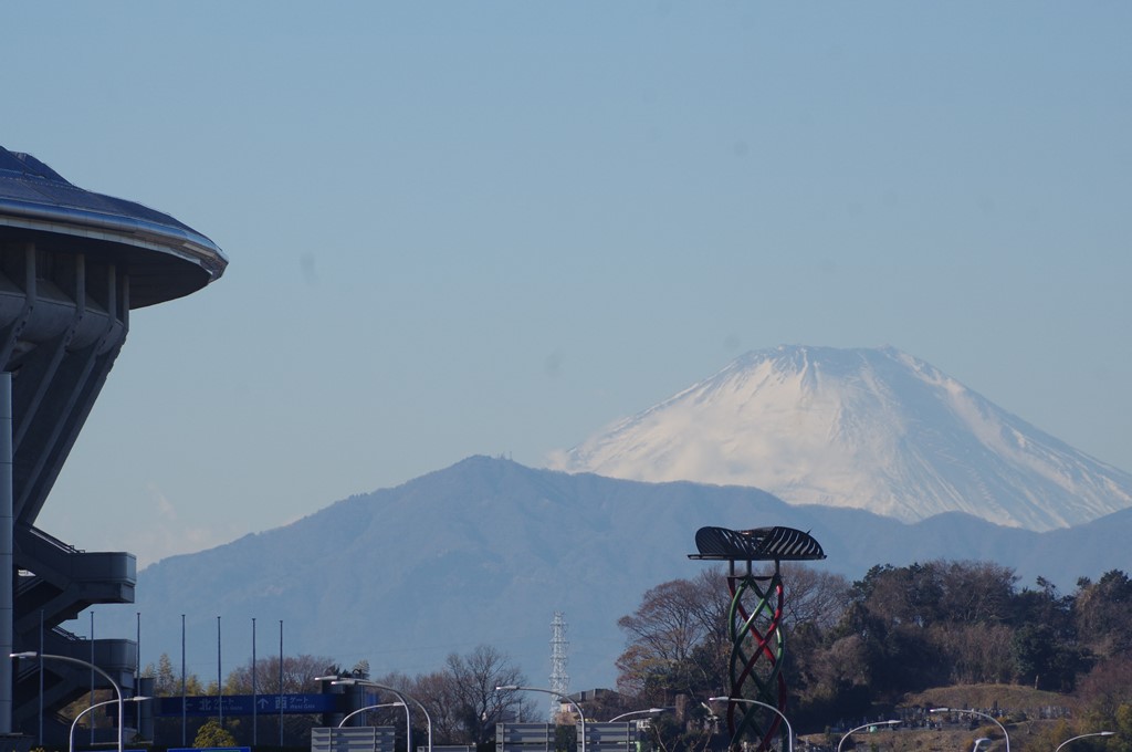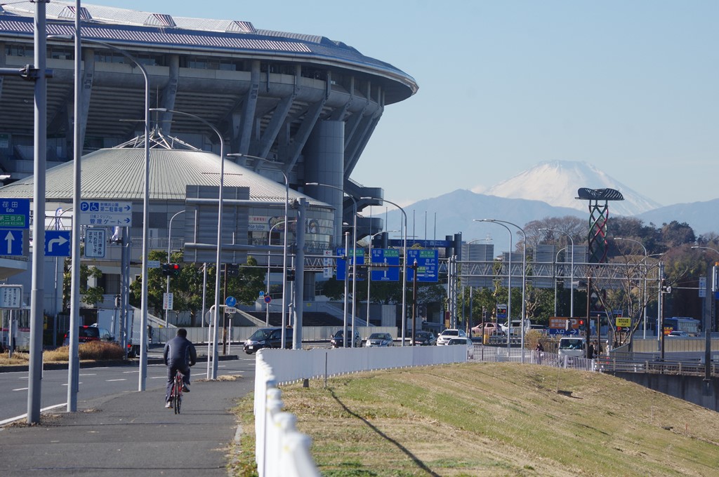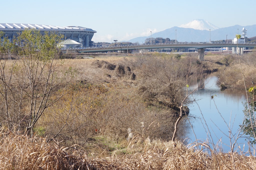 2017年12月28日(木)午前、鶴見川の新横浜付近から、日産スタジアムとともに富士山を撮りました。