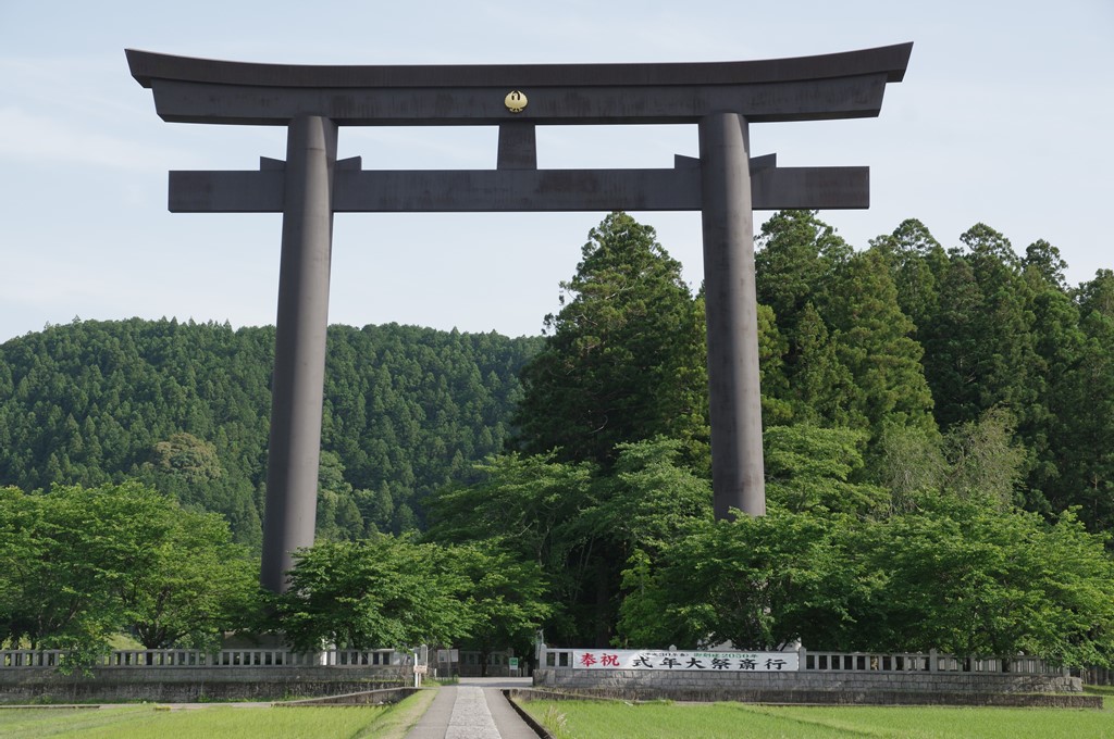 写真17は、2000年に建てられた日本一の大鳥居です。鋼鉄製(耐候性鋼板)で高33.9m・幅42.0m・柱径2.7m・柱間隔24.5m・172tです。本鳥居は現社地の南に約500mの旧社地前に聳えています。