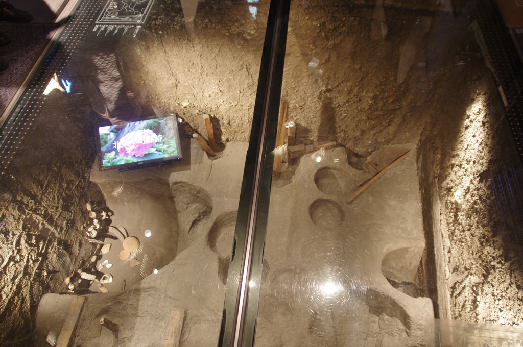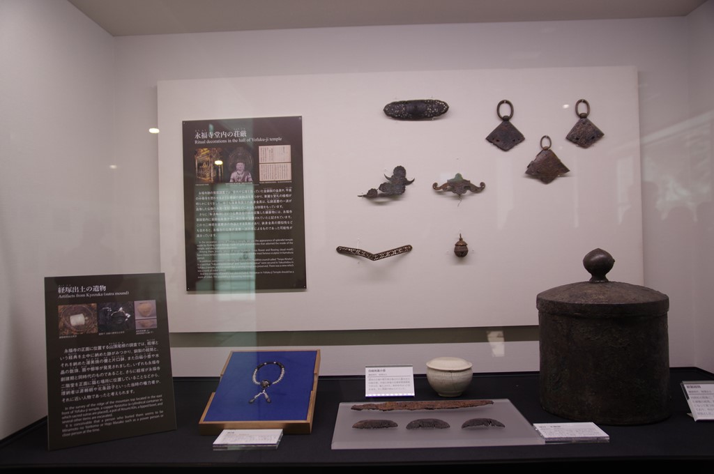 最初の見学地は駅西北の鎌倉歴史文化交流館(入場料300円 開館時間10~16時 休館日日・祝)です。写真1は、2中世展示室の永福寺関係出土品です。上が永福寺遺址からの出土品です。下が寺正面の東側の山頂尾根にある経塚遺址からの出土品です。左から水晶数珠・白磁有蓋小壺・銅製經筒です。