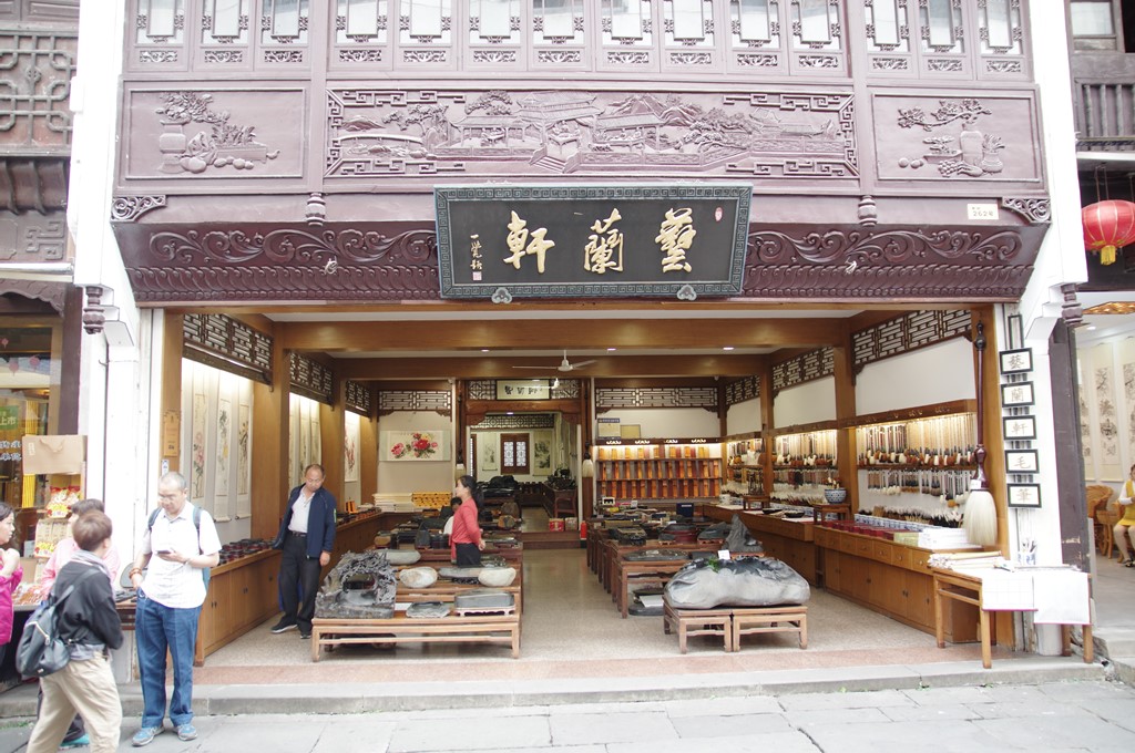 写真18は、文房四宝、すなわち筆・墨・硯・紙の内、紙を除く三宝を扱う「藝蘭軒」です。黄山市歙県等は中国四大名硯の一つ、歙硯の産地です。本店はこの老舗です。店内中央にそれらが並べられています。