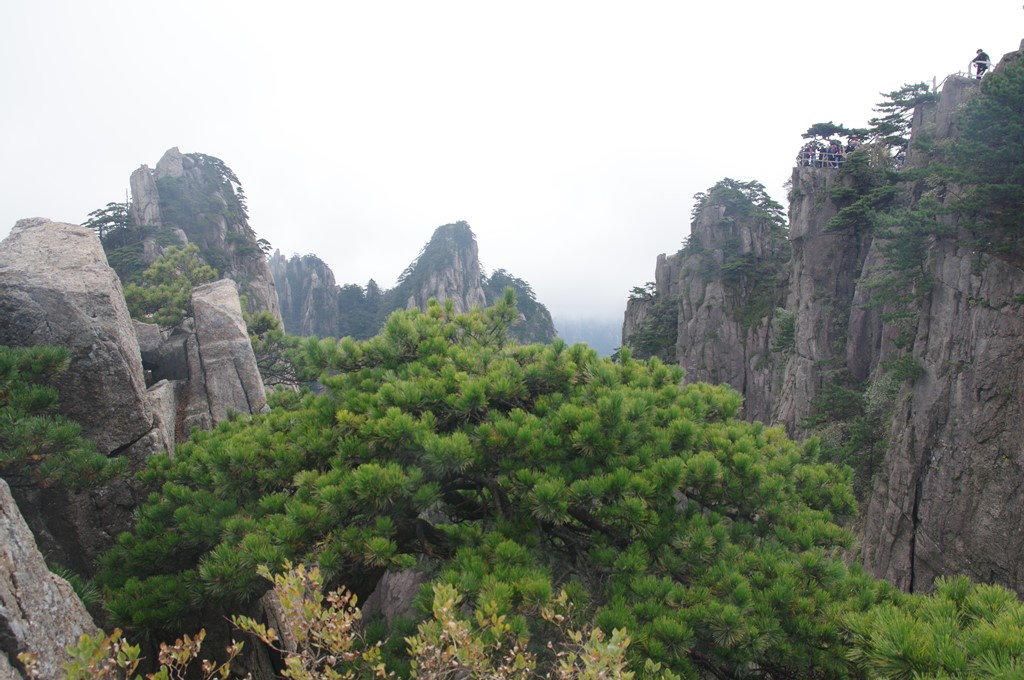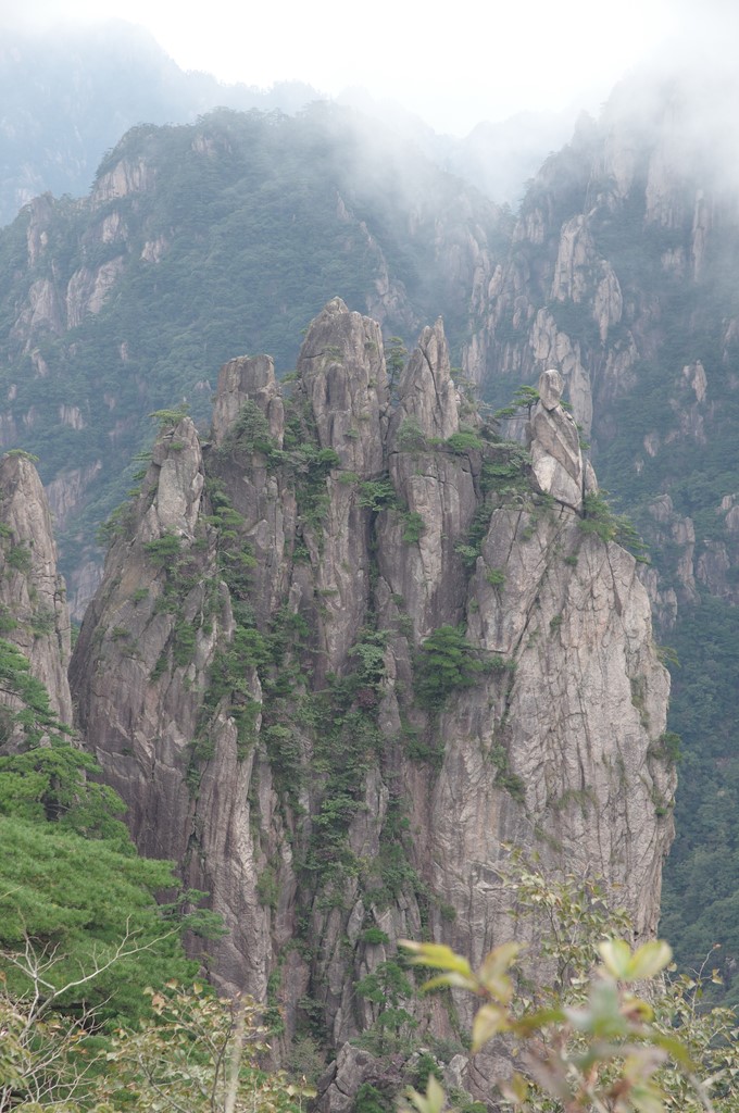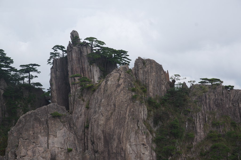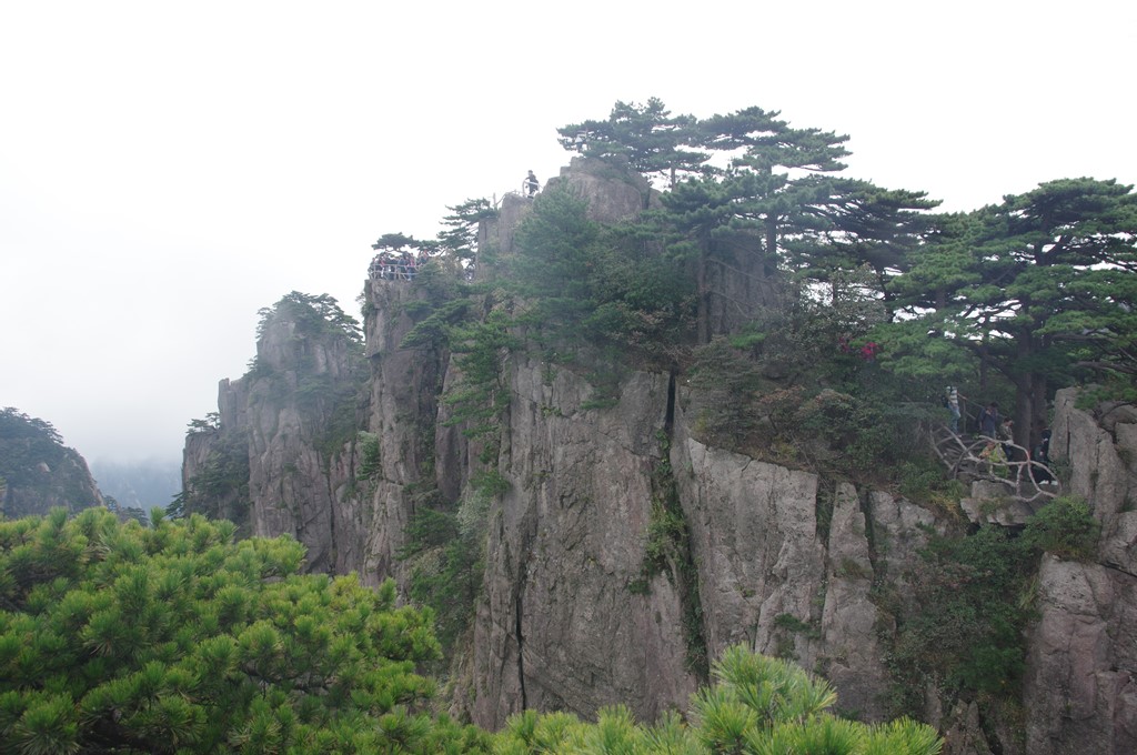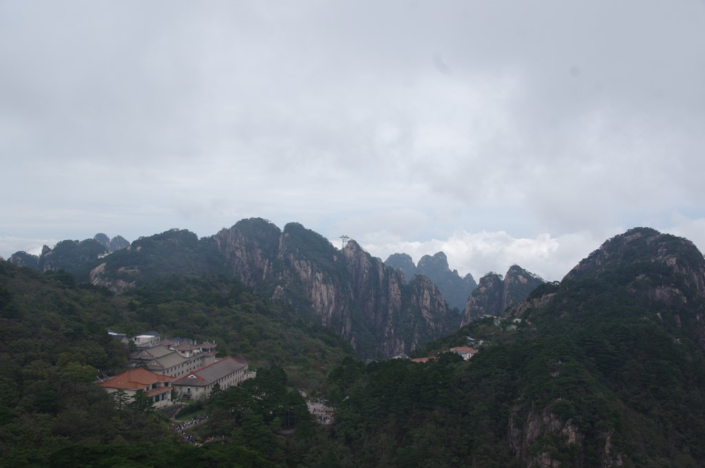 26日(水)は、引き続き黄山観光です。本来は曙光亭での御来光を迎えるつもりでしたが(ホテル掲示の天気予報では60%の確立)、前日からの曇天で見込みなしとして出かけませんでした。そして、9時に西海賓館を出発して、始信峰に向かいます。写真1は、右手前の夢筆生花です。