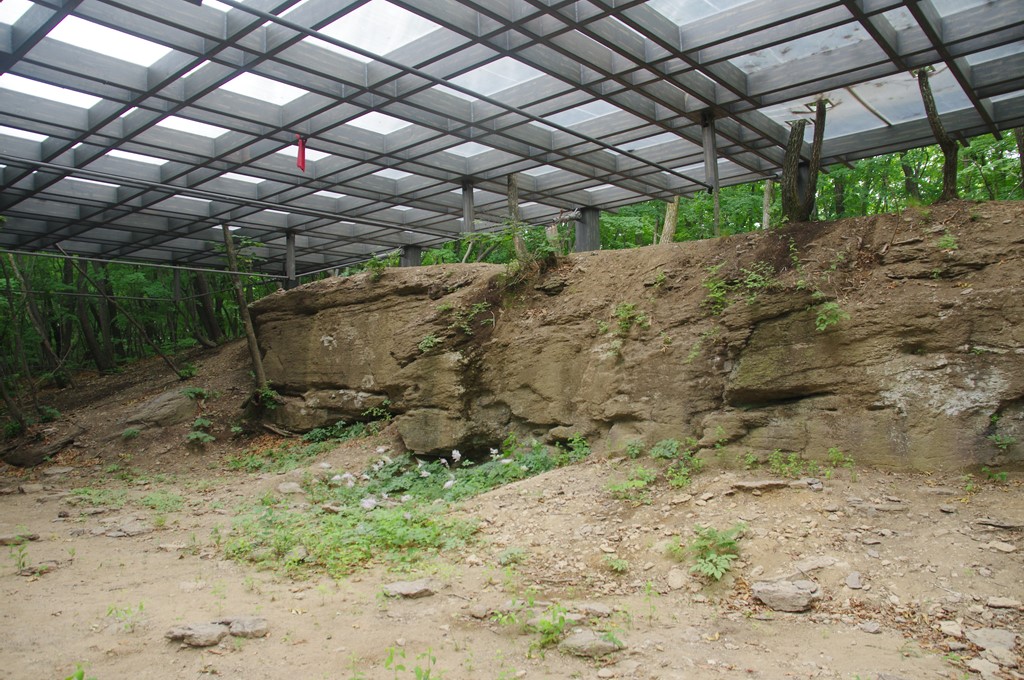 写真7は、二号大型建築遺址です。長20・幅9.5m、東西に3列の礎石(列に10個)があります。崖下には黄土台が設置されています。